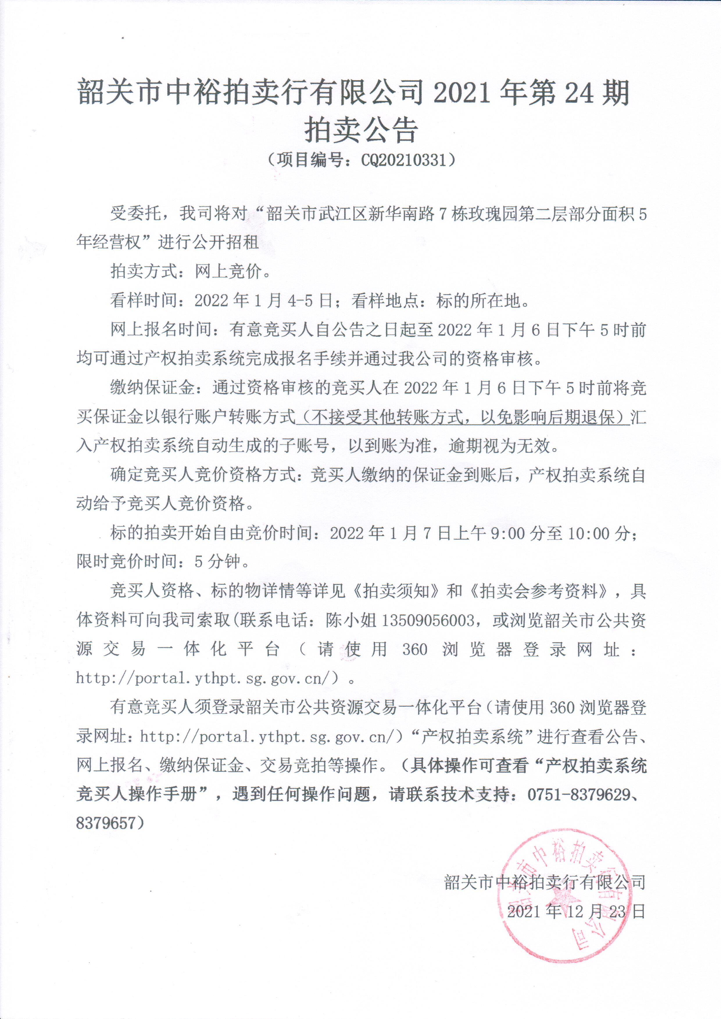 韶關(guān)市中裕拍賣行有限公司2021年第24期 拍賣公告 (項(xiàng)目編號:CQ20210331)發(fā)布時間:2021-12-24 | 作者: | 點(diǎn)擊:0次