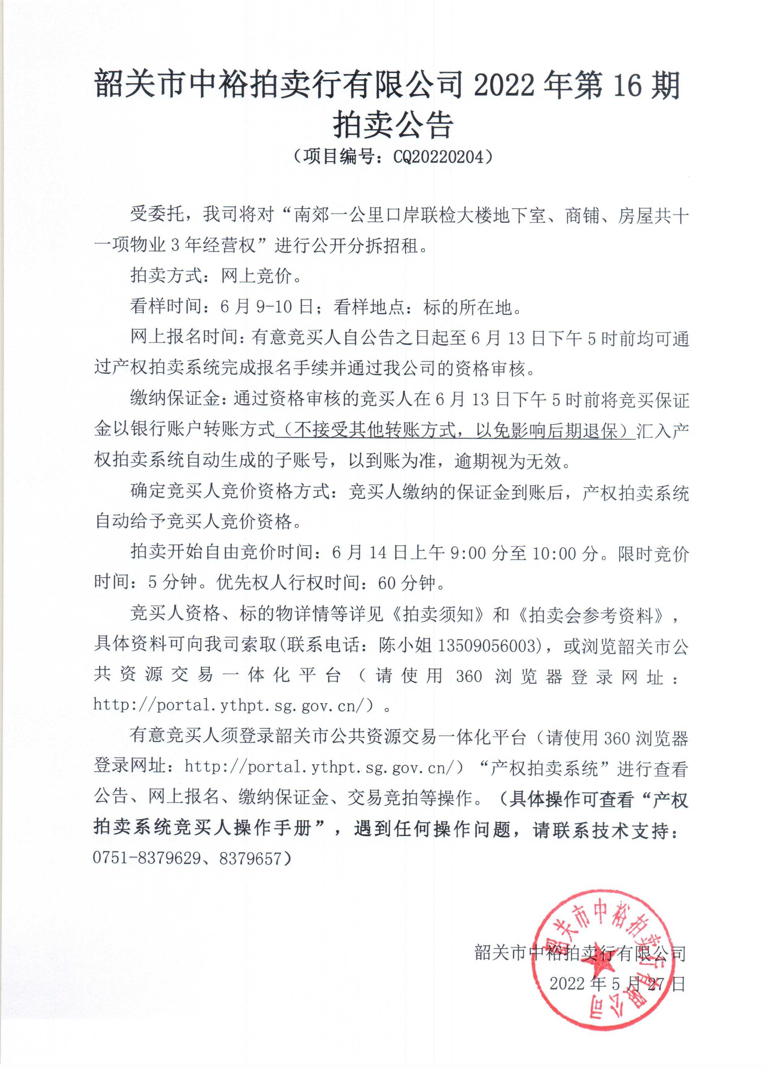 韶關(guān)市中裕拍賣行有限公司2022年第16期拍賣公告(項(xiàng)目編號(hào):CQ20220204)發(fā)布時(shí)間:2022-06-01 | 作者: | 點(diǎn)擊:0次