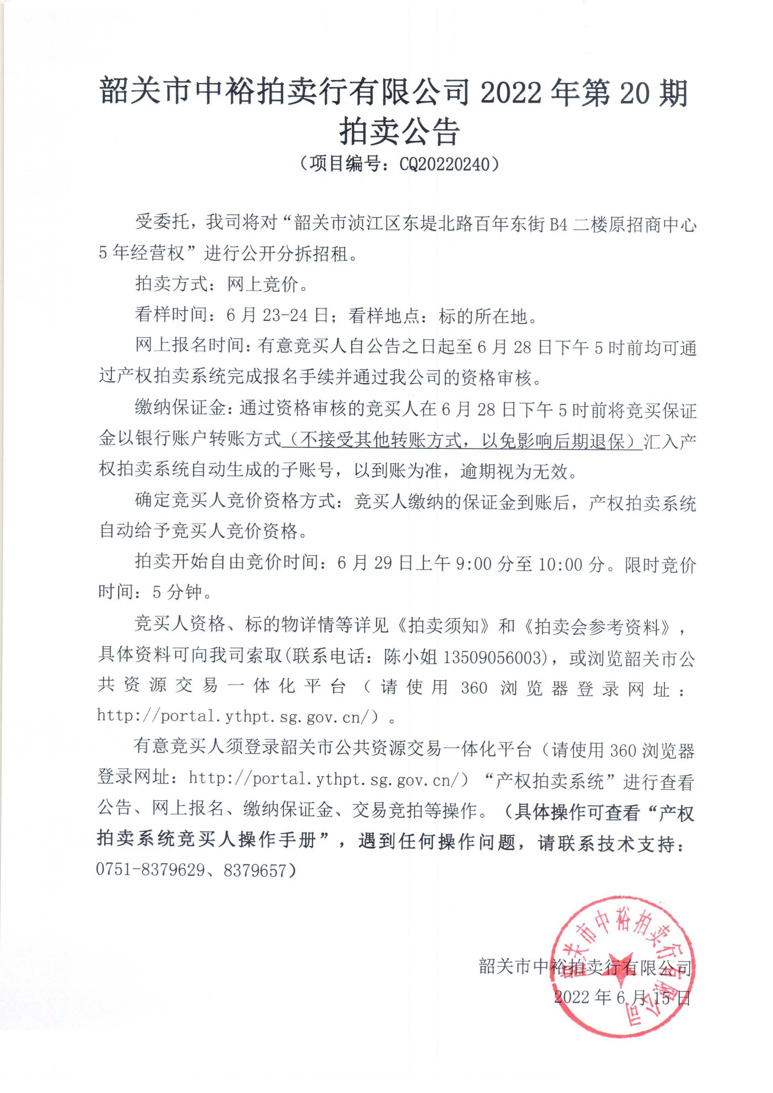 韶關(guān)市中裕拍賣行有限公司2022年第20期拍賣會(huì)參考資料發(fā)布時(shí)間:2022-06-15 | 作者:尹加 | 點(diǎn)擊:0次