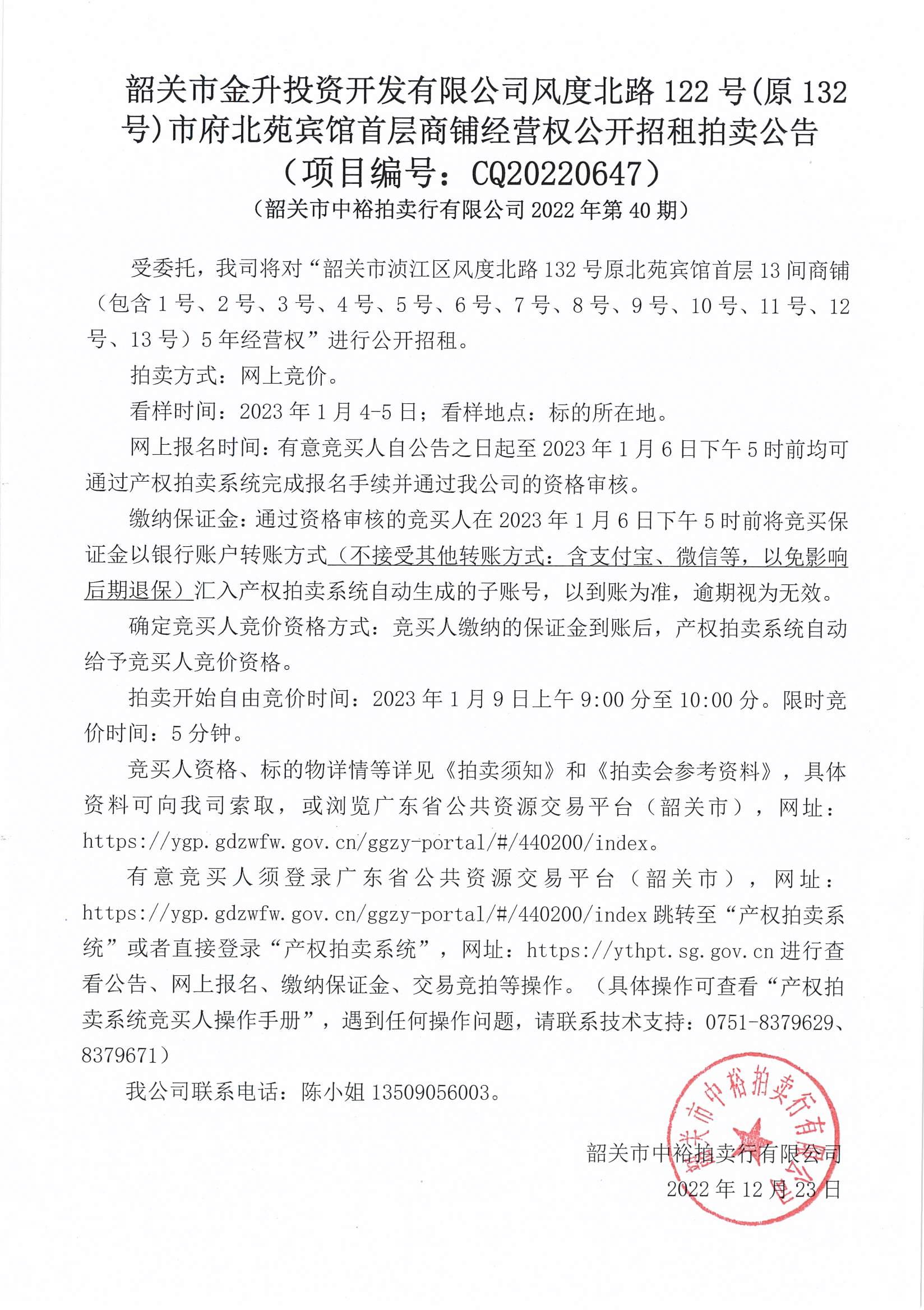 風度北路122號(原132號)市府北苑賓館首層商鋪經(jīng)營權(quán)公開招租拍賣公告發(fā)布時間:2022-12-28 | 作者:陳耀英 | 點擊:0次